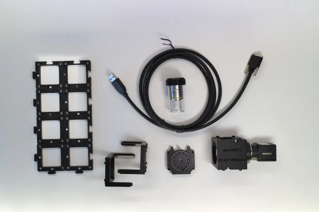 Adds a 488 nm LED excitation source, dichroic mirror cube, and emission filter. Real fluorescence microscopy on a student budget. Requires: CoreBox + Electronics + Infinity.